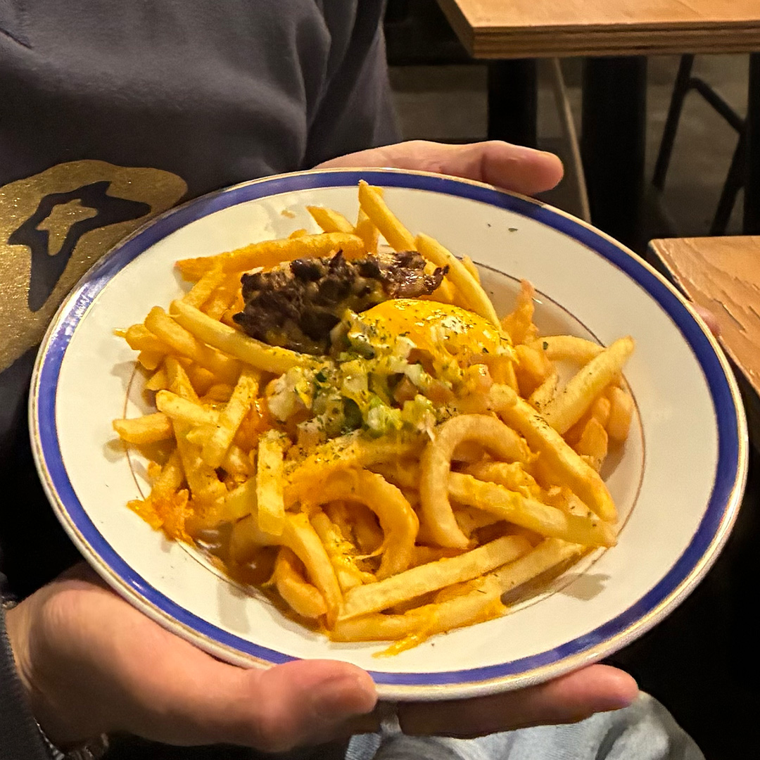 カールがかってカリッと揚げられたポテトの上に乗っかったほろほろのビーフとチーズ、酸っぱいタコスのソース、そしてクリームチーズ。ひと口頬張ると、塩気の効いたポテトとそれらのマリアージュが半端じゃなかったんです。僕は文字通り、ぶっ飛びました。その後も楽しくお肉を食べて、先輩からいろんな話をきいて、僕もいろんなことを話して、気づいたら3時間が経過。