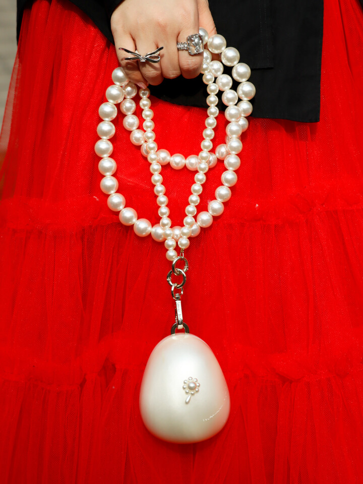 幸運の象徴ーパールをアクセやバッグ、靴にあしらいました。